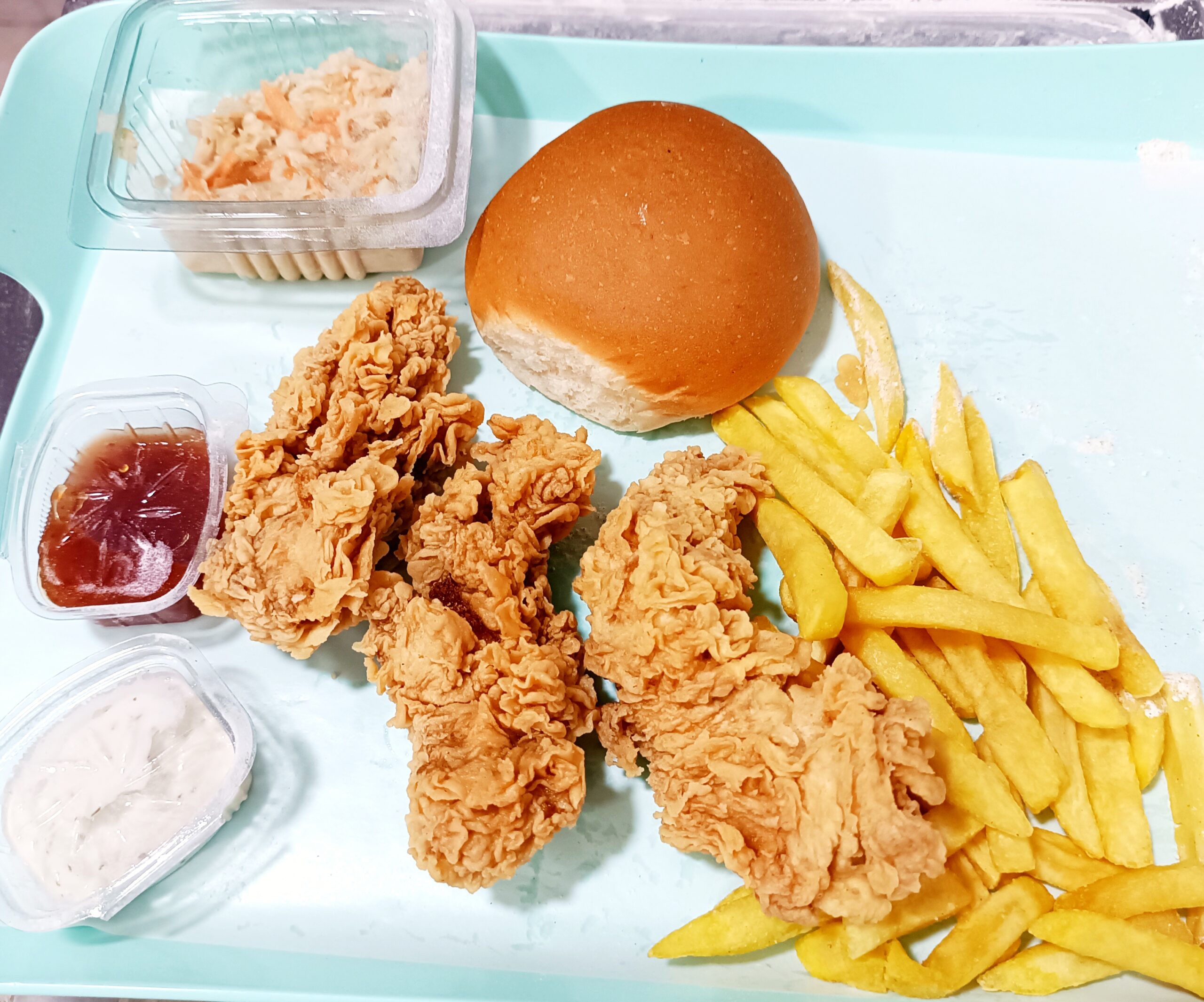یک تیکه فیله و یک تیکه استیک ران و یک تیکه ساق ران مرغ سوخاری شده هر دو  نرمال کمی اسپایسی و یک پرس سیب زمینی و سه عدد سس و یک نان بروتچن و یک سالاد کلم